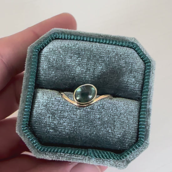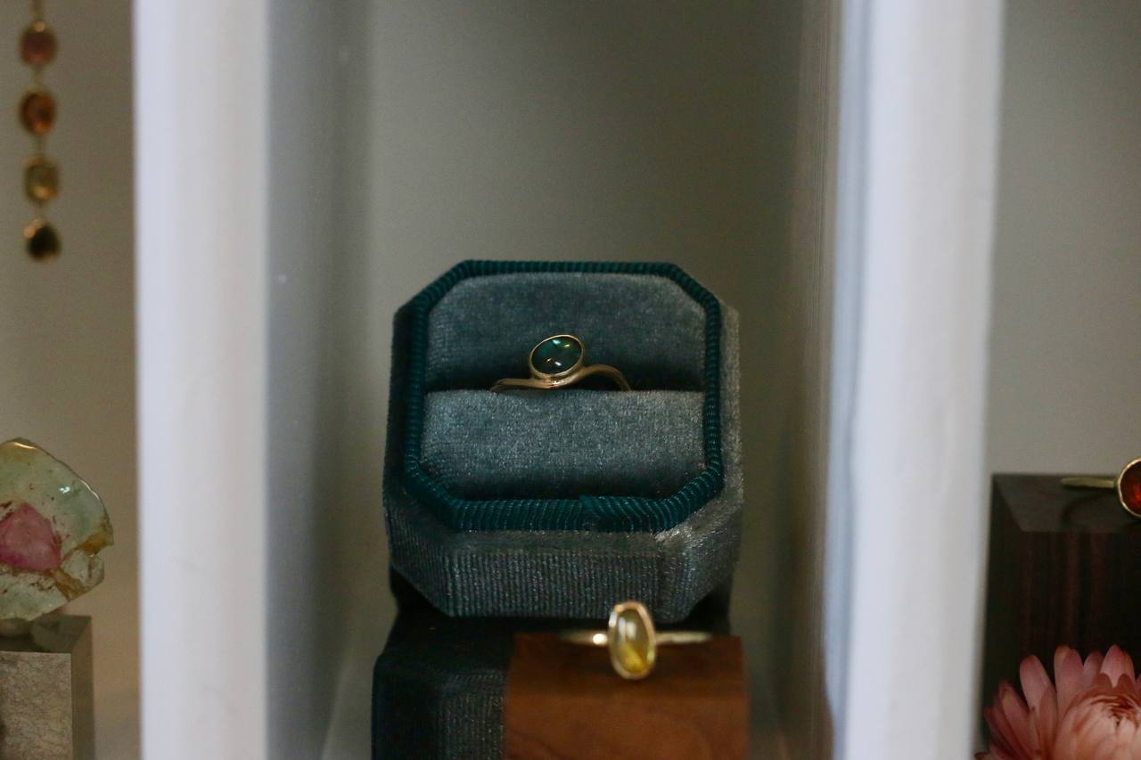 De achterkant van de zetting is gesloten met een plaatje argentium fijnzilver op de bodem van het 14k geel gouden zetkastje zodat de kleuren in de edelsteen het allermooiste worden gereflecteerd.